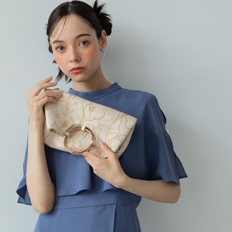 持ち手部分が真鍮のリングデザインとなっており、アクセサリー感覚でドレスアップできるアイテムです。