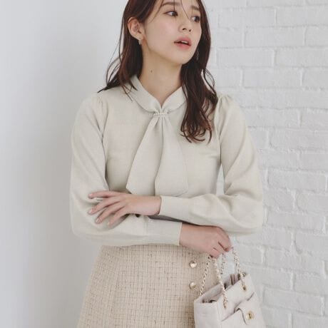 ・タブの部分に着映えるコールド×パール調のパーツがあしらわれていて、顔周りに華やぎを与えてくれます。