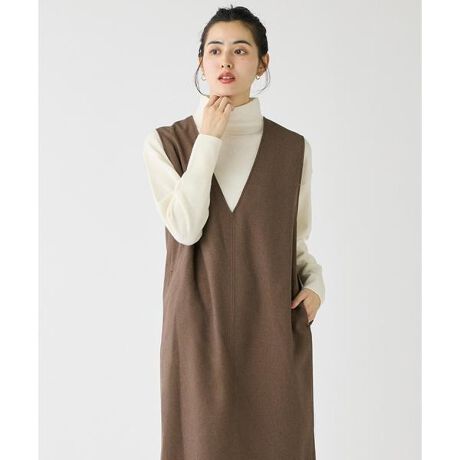 スッキリとした印象を与えてくれる深Vネックのジャンパースカート。身体のラインを拾わないゆとりのあるサイズ感と広めのアームホールで様々なインナーとのレイヤードをお楽しみいただけます。後ろベンツで足さばきも良く、きちんと感と機能性を両立した快適な着心地です。ウールの様なあたたかみと優しいタッチを持つ素材を使用し、ご家庭でお手入れできるイージーケア性も魅力です。・水洗い可・裏地あり・後ろファスナーあり・ポケットあり■素材■しなやかで柔軟性のあるリサイクルポリエステルと、BRING糸の配合と整理技術により、かさ高性と非常にやさしいタッチの両方を実現した素材です。■サンプル撮影商品■こちらの商品はサンプルでの撮影となっております。実際の商品とは、サイズや色味、素材、デザイン等の仕様が若干変更になる場合がございます。