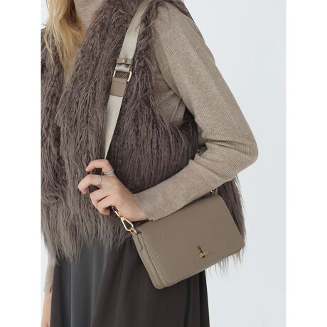 シボの風合いが落ち着きを感じさせる、上質なソフトカウレザーを使用。ショルダーストラップには艶の美しいテープベルトを採用、金具使いとも馴染みの良いどこか上品な雰囲気をもった一品が完成しました。
