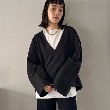 ・スウェットは深めに開いたVネックが抜け感を出し、顔周りをすっきりと見せてくれます