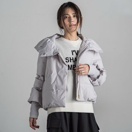 顔周りが華やぐボリューム襟と袖リブがポイントのダウンジャケット。