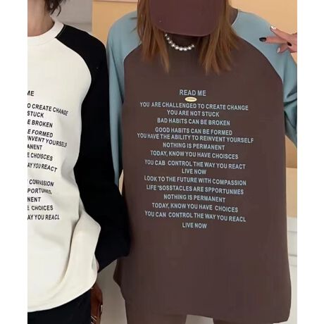 ラグランスリーブデザインが肩回りを動かしやすく、カジュアルでリラックスした雰囲気を演出します。柔らかな素材で着心地が良く、デイリー使いに最適。配色切り替えがお洒落で、シンプルながらも個性を引き立てるデザインです。フロントのメッセージはポジティブな内容のため、コーディネートに元気な明るさもプラスします。デニムやカジュアルパンツ、スカートとも合わせやすい万能アイテムで、様々なシーンで活躍します。
