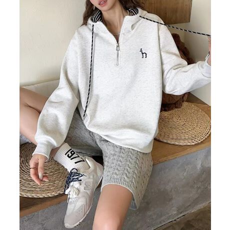 暖かく柔らかな裏起毛素材で、肌寒い季節でも快適に過ごせます。ハーフジップ仕様で、着脱が簡単でスタイリングの幅も広がります。フード部分のストライプ柄の裏地がアクセントとなり、カジュアルな中にもおしゃれさをプラス。ワンポイントの鹿の刺繍はさりげないアクセントに。豊富なカラーバリエーションで、お好みの色を選んでコーデを楽しめます。デニムやスカート、ジョガーパンツとも相性が良く、デイリーコーディネートに活躍する万能アイテムです。