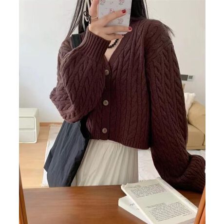暖かみのあるざっくりしたケーブル編みのVネックカーディガン。