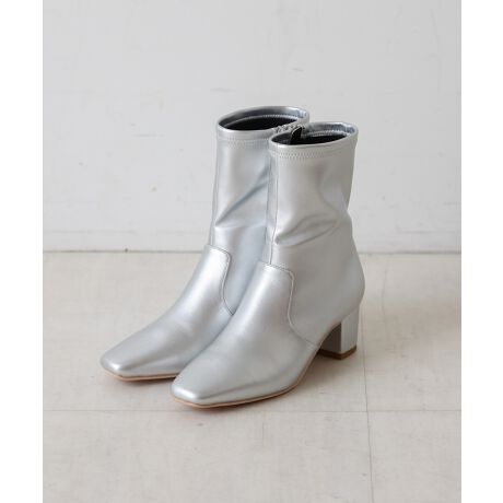 ストレッチ素材を使用したスクエアトゥのショートブーツ。アンクルまわりはタイトな仕様になりますが、ストレッチがきいているのですっきりとして見せてくれます。ヒールは太めで安定感があり、履き心地も快適です。