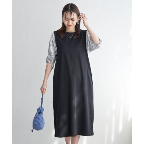 やわらかいポンチ素材と、袖がシャツ地の着心地の良いワンピース。