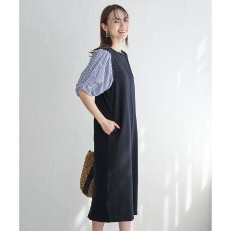 やわらかいポンチ素材と、袖がシャツ地の着心地の良いワンピース。
