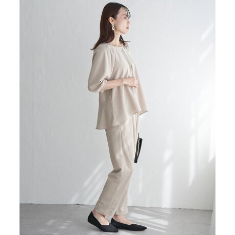 トップスはしなやかなカットソー素材にバックペプラム切り替えを施し、動くたびにふわりと優雅なニュアンスをプラス。