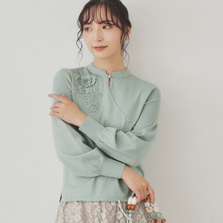 衿元のチャイナパーツと華やかなレースに目を奪われるSunaUnaらしいチャイナテイストのニットです。