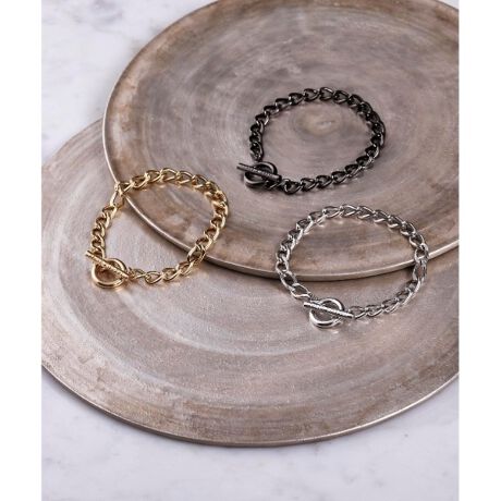 存在感のあるボリューム真鍮チェーンと洗練されたマンテル留めが組み合わさったチェーンブレスは、シンプルなスタイルに個性をプラスします。