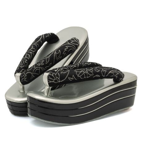 艷やかなエナメル加工の天や巻に、銀糸が煌めく糸で織り込まれた花唐草の鼻緒が美しい草履です。