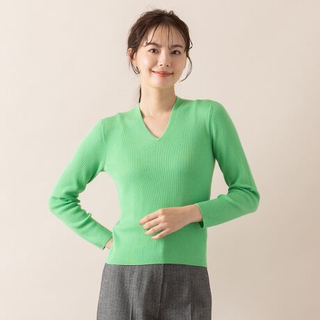 すっきりと綺麗に見えるリブ編みニット。Vネック開きで顔周りもシャープな印象に。