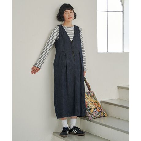 [型番:26440758]シャープな深Vネックとフロントジップが印象的なデニムワンピース。Iラインに近いすっきりシルエットが、シンプルながらも洗練された雰囲気を演出。Tシャツでカジュアルに、シアートップスで大人っぽくと、気分次第で表情を変えられる万能デザインです。【素材】デニム素材。【デザイン】深Vネック、フロントジップ使い。【ポイント】Iラインに近いすっきりシルエットに、ウエストまわりはタック使いにして腰回りが気になりにくいデザインにしました。