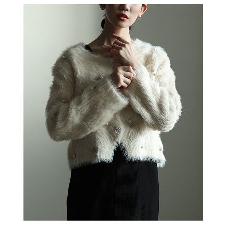 煌きビジューとパールのフェザーニットカーディガン。ふわっと暖かなフェザーニットにパールとビジューを散りばめたデザイン。毛足の長いフェザーニットがエレガントな雰囲気を惹き立ててくれます。暖かさと華やかさが両立された、派手過ぎない高見えカーデです。結婚式やパーティの羽織りとしても活躍します。
