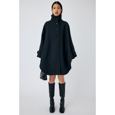 【CAPE COAT】たっぷりと贅沢に生地を使用した、シルエットが可愛いケープ型のコート。面積が多い分のっぺり見えないよう、ベースのカラーと微配色の3色の糸を織り込んだ生地にこだわり、フロントにはMOUSSYオリジナルの大きな練りボタンを使用。幅広な袖口には付属のベルトがついており、きゅっと絞ったシルエットでもご着用いただけます。サッと羽織るだけで、気品高い雰囲気を纏わせてくれる1着。襟元はハイネックですが、インナーにタートルネックなどを合わせるときは、襟を折り返しての着用も可能です。オーバーサイズのニットや、袖の大きいトップスの上からでもまるっと着こむことができ、スカートやワンピースでレディに合わせられるのはもちろん、今季はカジュアルなラインパンツにスニーカーなどのスタイリングもおすすめです。■透け感:なし■光沢感:なし■伸縮性:なし■裏地:あり