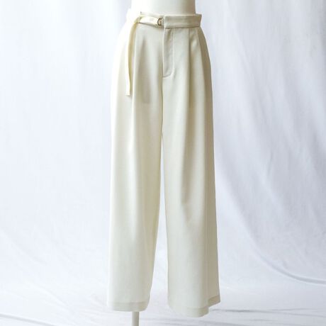 デザイン:シルエットの美しさが際立つ落ち感のよい素材を使用したワイドパンツ。Dカンベルトパーツを施しサテン素材のベルトのウエストデザインがポイント。ウエストは後ろゴム仕様になっています。