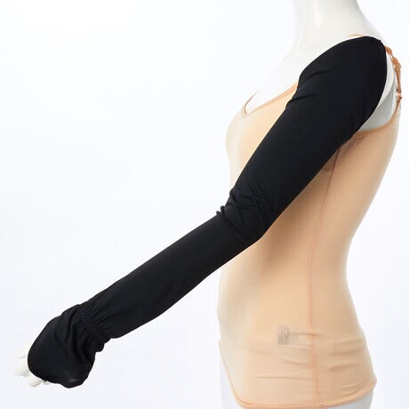 接触冷感機能糸を使用したベア天竺素材を採用しました。手の甲までしっかり日よけができるような仕様です。手首部分がゴムシャーリング仕様になっており、手甲カバー部分が邪魔な時はたくし上げることができます。