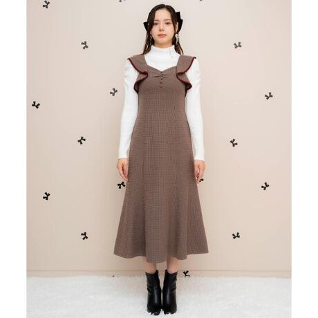 シャープなパイピングデザインのフリルを施した、レディ感あるマーメイドジャンスカ【Design】・パイピングデザインがシャープな印象を加えてくれるので、こなれ感のあるコーディネートに仕上がります♪・顔周りを華やかに見せてくれるボタン&ギャザーデザインもポイント!・タイトすぎないソフトなマーメイドシルエットで、女性らしさをアピールしてくれます。・シンプルなニットトップスとの相性抜群♪トップス×ワンピースのレイヤードスタイルをお楽しみいただけます◎・後ろにはリボンが付いており、ウエストを絞ったり調整いただけます。・後ろファスナー仕様。・シャーリング&レースアップ仕様なので、お好みに合わせてウエストラインをご調整いただけます。【Fabric】・温かみを感じさせるポリエステル素材の生地を使用。・ボルドー、ブラウンチェック、グレーの3色展開となります。【Care】ドライクリーニング