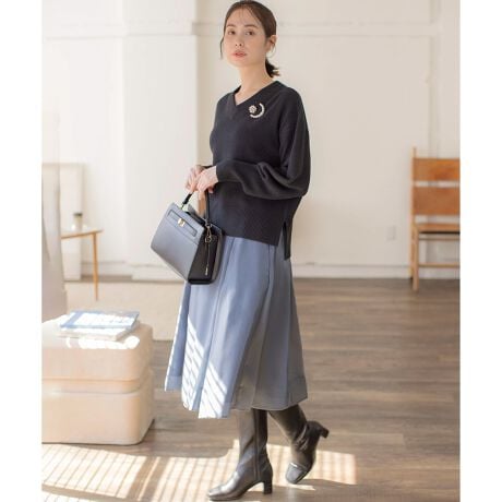 ■素材繊細さと華やかさを備えたオーガンジー素材。品がありながらもキラッと輝く華やかな雰囲気に仕上げており、上品でクリーンなムードが漂う表情に仕上がっています。絶妙な光沢感とハリ感、透け感が大人の女性にぴったりです。シワが気にならず、軽やかな着用感も魅力です。カジュアルにもキレイめシーンにも活躍してくれ、コーデのマンネリをカバーアップしてくれる素材です。