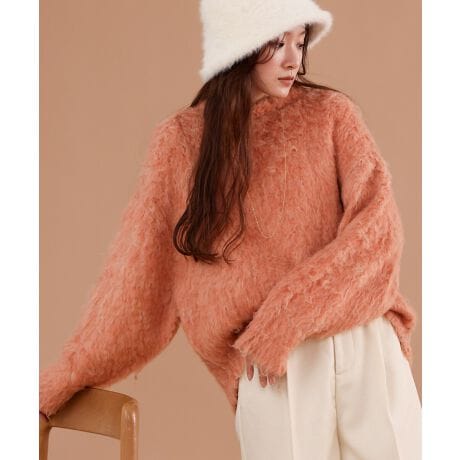 首元をほどよく覆うスタンドネックが印象的なフワフワのケガキニットプルオーバー!見た目にも暖かく、可愛らしいフェミニンな印象を与えてくれる一枚です。ボディラインを拾わないゆったりとしたサイズ感で、カジュアルからキレイめまで幅広いテイストのコーディネートに着映えします。様々なカラーがミックスされており、角度によって異なるニュアンスが楽しめるデザインも魅力です。