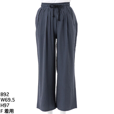 【洗える】【ウエストリブ】ストライプ ワイドシルエットルーズパンツ