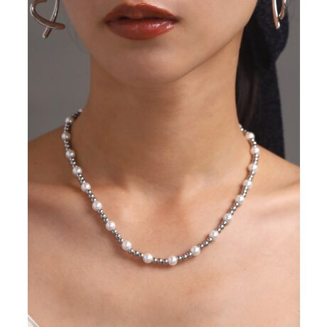 ●メタルボールとパールを連ねたチェーンネックレス。