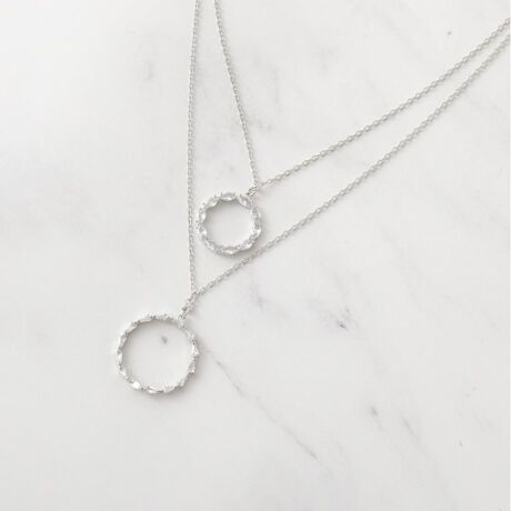 2つの異なるサイズの円形ペンダントが重なっているデザインで、シンプルながらも立体感と華やかさがあるため、日常使いから特別なシーンまで幅広く大活躍。