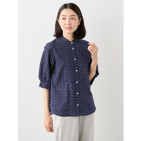 爽やかなドット柄のブラウス。意匠性のある凹凸感ある綿100%素材はこれからの暑い夏に向けて肌離れが良く快適に過ごせます。流行に左右されないドット柄はナチュラルトラッドな雰囲気に。エレメント定番のデニムと合わせて落ち着きあるフェミンジーニングスタイルとしてお勧めです。
