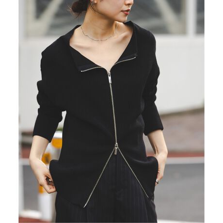袖はタイト&身頃はゆとりのあるシルエットに、フロント全身に配したジップがポイントとなり、カジュアルテイストでありながら女性らしく着られる一着です。