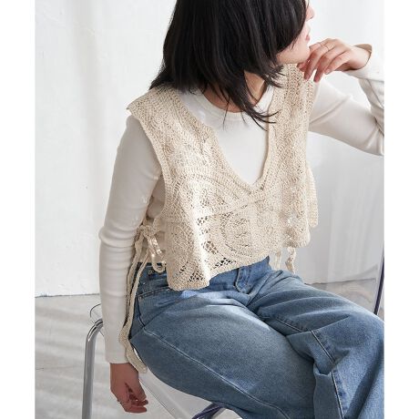 繊細なかぎ編みデザインとサイドリボンがポイントのかぎ編みサイドリボンベスト。