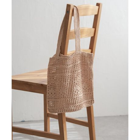 幾何学模様のような洗練されたかぎ編みが特徴のトートバッグ。