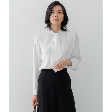 ボウタイが甘過ぎず、大人の女性が着用しやすいデザインになっています。フロントのボウタイを中にしまうことでスタンドカラーブラウスとしても着用して頂けます。ボトムを選ばないので、オンオフ幅広いシーンで活躍してくれます。七五三や学校行事など、あらたまったシーンではジャケットやジレを合わせて、上品で特別感のある装いに。汎用性が高いので、シーズンやシチュエーションに合わせて様々なスタイリングをお楽しみいただけます。カラーはクリーンなホワイト(#001)、シックなネイビー(#075)の2色展開です。