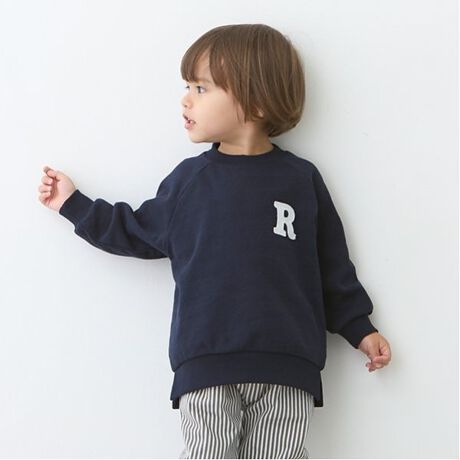 アルファベットのアップリケが目を引くトレーナーです。