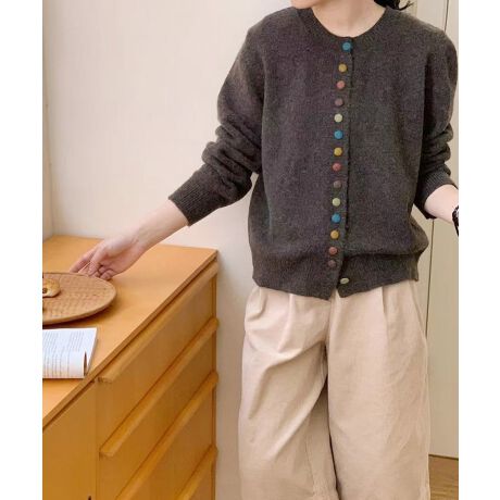 シンプルなデザインにマルチカラーのボタンがアクセントとなったカーディガン。柔らかなニット素材で仕上げており、肌触りが良く、快適に着用できます。ボタンの色が異なることで、さりげないおしゃれ感を演出し、シンプルすぎない洗練された印象に。ベージュ、レッド、グレーなどの落ち着いたカラー展開で、カジュアルからフェミニンまでさまざまなコーディネートにマッチします。デイリー使いからちょっとしたお出かけまで、季節を問わず幅広く活躍するアイテムです。