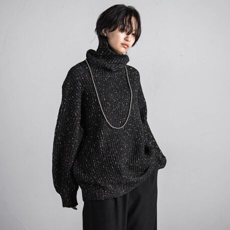 ざっくりとしたフォルムと、ホイル状のラメが華やかなオフタートル・ニットプルオーバー。