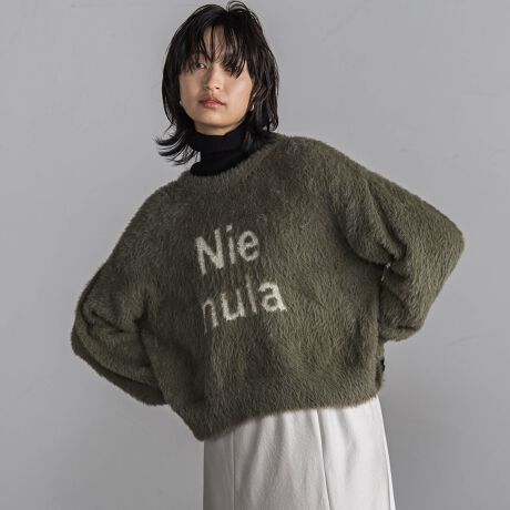 柔らかく心地良いシャギーニットでロゴを表現した、遊び心ある一枚。