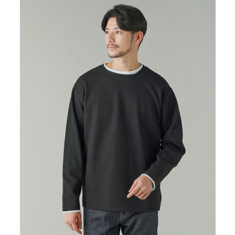 本体の生地には、サラリとした肌触りのポリエステル混紡素材を使用しました。表面は凹凸感のある鹿の子生地でさり気なく表情をプラス。フェイクレイヤード部分は襟元と袖口のみとなっているため、重ね着をしたとき特有のごわつき感がなく快適にお召しいただけます。