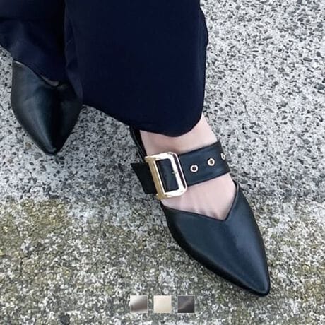 【26春夏新作カラー追加】ポインテッドトゥVカットバックルベルトミュールパンプス