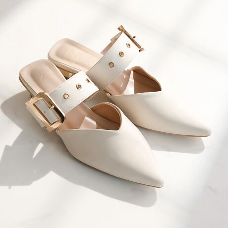 【26春夏新作カラー追加】ポインテッドトゥVカットバックルベルトミュールパンプス