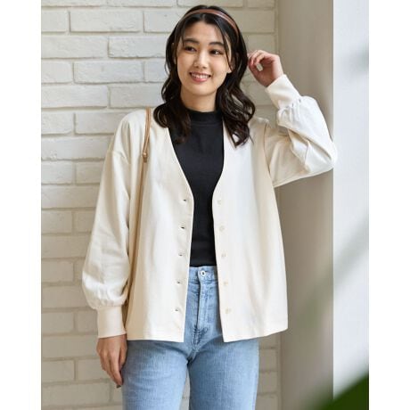 仕立て映えのする張り感のあるポンチ素材を使用したカーディガンです。袖にニュアンスが出るようなシルエットで作りました。