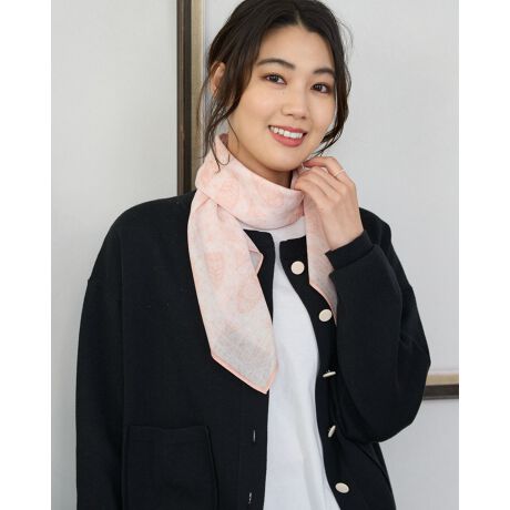 薄く軽やかなポリエステルの生地。細かく広がるツイルの畝と、ほのかな光沢が上品なアイテム。小さく畳めて持ち運びしやすいところも魅力。細いラインや小さなモチーフでアンティークレースを表現しプリントしています。優しいピンクと、クリアなグリーンカラーで仕上げた儚げなスカーフ。モチーフの中に忍ばせたWのイニシャルもポイント。80cmの大きな正方形型でラフに首元に垂らしジャケットやジレを羽織るスタイルがお薦めです