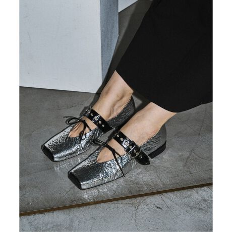 構築的なボックストゥとハトメのベルトでモードに仕上げたメリージェーン。