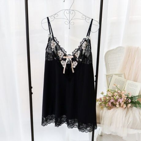 カップ下は大胆なV字カッティングと、中央にほどける仕様のリボンをあしらい、思わず手にとりたくなるようなデザイン性の高いアイテムに。ストラップにはレースのお花と別カラーのアップリケを、裾とバックスタイルにはレースをほどこして華やかさをプラスしています。