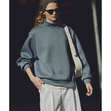 ゆとりのあるサイズ感と、襟元とサイドのファスナー使いが特徴的なデザインです。