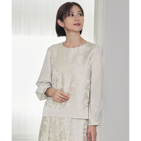 大人らしいフラワー柄を表現したプルオーバーブラウス■デザイン身頃とカフスはオパール、袖は無地の別布でブロッキングしたプルオーバーブラウスです。裾に透けない部分を残すことで繊細なプリントの陰影を際立たせ、シンプルなデザインを程よく華やかに演出します。素材の繊細な華やかさを生かし、ネックラインの美しいブラウスに仕上げました。1枚で着る時やジャケットを脱いだ時も華やかに見える程よいボリュームのパフスリーブが上品で、無地のボトムと合わせてもさりげない華やかさのあるコーディネートが完成します。同素材のスカート(SKWMGS0005)と合わせてワンピース風のコーディネートもおすすめです。セレモニーシーンやお食事会、顔合わせなどに活躍します。■素材適度な光沢とハリ感のあるシャンタン素材にオパール加工を施し、クリスマスローズなどの冬の花をモチーフにした透かし柄を入れています。■同素材アイテムスカート(SKWMGS0005)