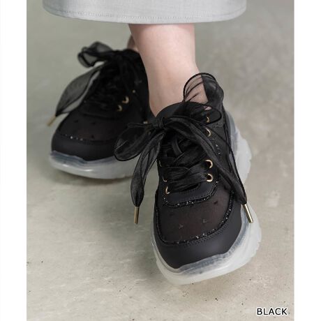 上品なシフォンリボンとハート刺繍がチャーミングなスニーカー。