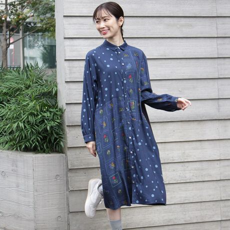 コットンレーヨンビエラフレームフラワー&ドットプリント×ミニ裏毛ワンピース(前開き)