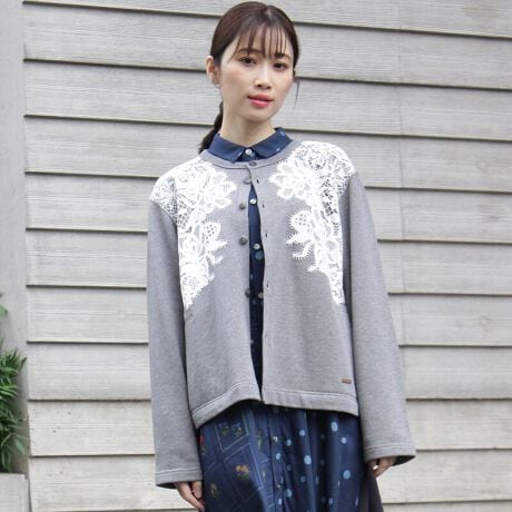 [型番:34940051]肌寒い季節にも活躍する30/10裏毛に、オリジナルのレースをあしらったカーディガン。アーティステックで大胆なレースが甘すぎない可愛さを演出してくれます。シンプルなカーディガンには左右にレースを施しました。両サイドにポケットがあるのも嬉しいポイントです。衿ぐりの見返しにはオリジナルのプリント生地を使用しています。お手入れ:手洗い店舗へお問い合わせの際は、下記の品番をお申し付け下さい。[品番:34940051]