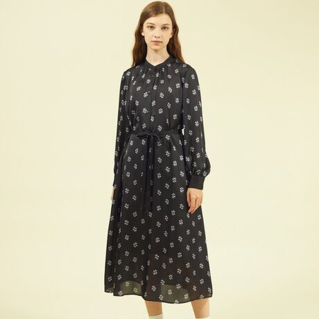 1枚でコーディネートの主役になる、クロッカス模様のワンピース。附属のリボンでウエストマークすることで、シルエット変化も楽しめます。上品な光沢があり、ちょっとしたお食事会にもおすすめです。